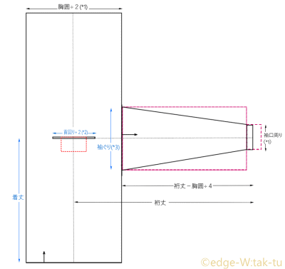(※3)「肩」がありつつ前後身頃の差は無くて良いってことならば、赤四角をもう少し(図の)上にずらした形になります(四角の半分が*2の黒線と重なる位置にずらす)。