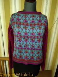 お料理っぽいタイトル付けるとしたら、「3種のダイヤ柄の盛り合わせ~ニューヨークのシャボン玉風」とでも云いましょうか(笑)。>あ、写真じゃ分かりませんけども、袖は、身頃の2色編み込みを表目裏目にしたガーンジー風模様になってるんです。それで3種。