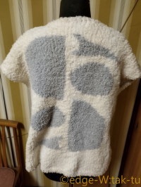 1枚のニットでレイヤードに見えるものを作る、ってのも今んとこ頭にはあって、機会があればやってみるかなと思ってますけど、第一候補として常に考えてたのは、「インナー側の長袖は細い糸でハイゲージのシンプルニット」「プリント入るオーバー側は太めの意匠糸を地にした、半袖というよりフレンチスリーブか、いっそベスト」って形でした。オーバー側をデザイン性高い意匠糸にすれば、純毛のストレートヤーンが持ってる「防寒」ぽさが薄れて「冬物のおしゃれ着」(実際におしゃれかどうかは兎も角・笑)として、重ね着した時の違和感薄れるかな、と思って。