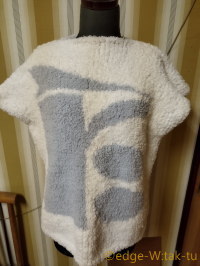 それと、フツーにオーソドックスなセーターの形で作るのも芸が無いというか、源がストンとしたTシャツでもあるし、裾や袖口・襟にリブを入れたくなかったので、オーバー側は作り目から編みっぱなし、インナー側の縁はガーター編みにしました(襟と裾はメリヤスでクルンとさせることも考えてたんだけど、袖口はそれを避けたかったんで…。何と云うか「要素が重なりすぎ」でバランス取れない気がして、袖の方に合わせた)。