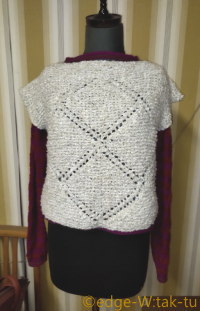 (※)写真にはハッキリ写ってませんが、もっと厳密に云うと、実は仕上げ(とじる)段階で「あかーん、何かちいせぇー!」てなったので(製図時より編む手がキツくなってたぽい;)、急遽、脇と袖下にマチになるパーツを編んで繋げています; 本当はそういうことにならないのが理想なので、作り方としてはソレ省略して進めます。